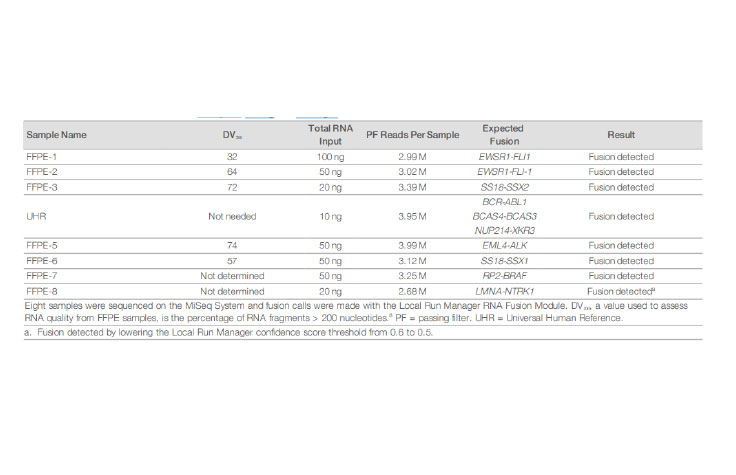 The Trusight RNA Fusion Panel is optimized for high performance from both high- and low-quality RNA sample types. Library prep requires as little as 10 ng total RNA, or 20 ng FFPE RNA. This low input requirement makes this panel ideal for reliable targeted analysis of limited quantity samples.