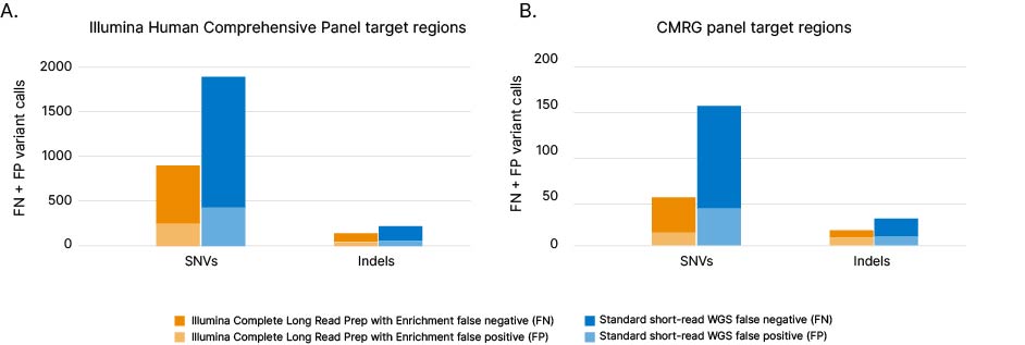 False negative (FN) plus false positive (FP) variant calls for SNPs and indels in HG002 genic regions targeted by the (A) Human Comprehensive Panel or (B) CMRG panel, using Illumina Complete Long Read Prep with Enrichment (orange) compared to standard short-read WGS (blue).