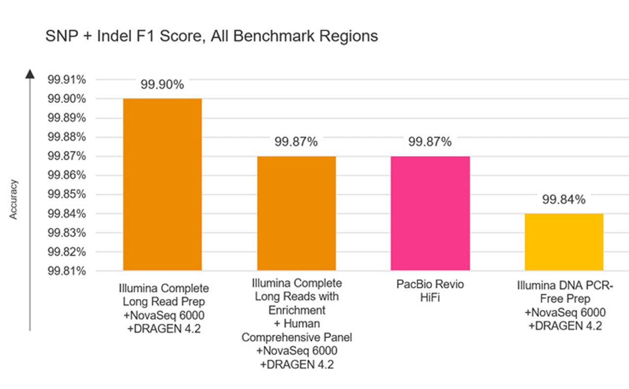 Illumina Complete Long Read Prep, Human은 PrecisionFDA Truth Challenge v2 데이터 세트1로 변이 검출(variant calling)에 대해 전례 없는 정확성을 제공하며, 이는 F1 점수(%), 즉 진양성 및 진음성 결과를 총 결과의 비율로 계산하여 측정한 것입니다.