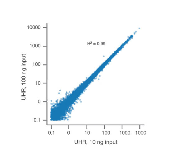 Illumina RNA Prep with Enrichment는 UHR(Universal Human Reference)에서 10 ng 및 100 ng Total RNA의 사용량 간에 높은 데이터 일치를 달성합니다.