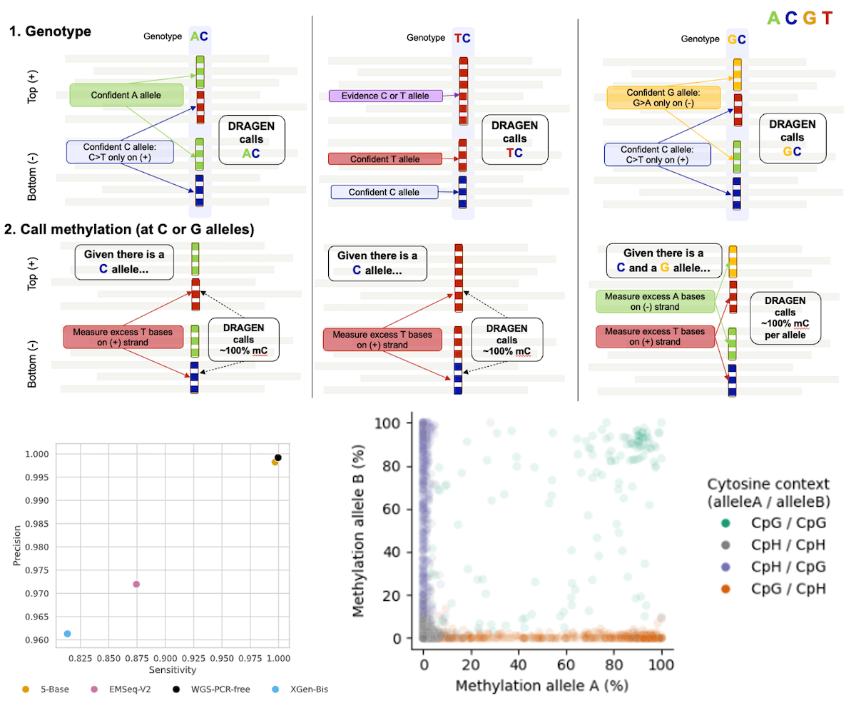 (Top) Example of the three heterozygous genotypes that can contain a methylated C allele. In all cases, the DRAGEN 5-base genotyper calls both alleles by using information across both DNA strands. After genotyping, the methylation level per C or G reference allele is called by quantifying excess C>T or G>A mutations on the (+) or (−) strands, respectively. (Bottom left) Germline SNV calling accuracy of the Illumina 5-base solution for NA12878 is comparable with WGS (EM-seq and Bisulfite processed by Bis-SNP, 5-base and WGS by DRAGEN). (Bottom right) Discovery of heterozygous variants in NA12878 (C>G or G>C) that introduce an allele-specific change in methylation status (purple, orange) by altering the allelic cytosine context (CpG to CpH, or vice versa). For example, a G>C variant will convert a CGH allele into a CCH allele, where the CpG context is lost in the alternative CCH allele.