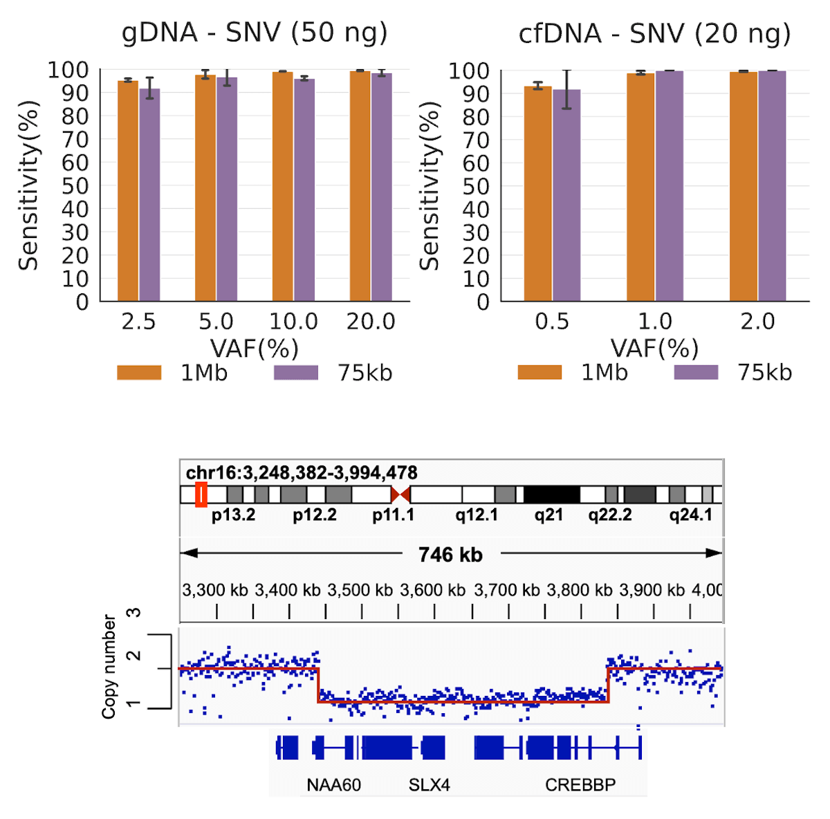 (Top) Sensitivity of somatic SNV detection at various variant allele frequencies. (Middle) Large variant calling accuracy (CNV/SV) in HG002. CNV accuracy is determined with Witty.er against the GIAB v0.6 truth set3. SV accuracy is determined with Truvari Bench against the Genome in a Bottle T2T-Q100 HG002 SV v1.1 truth set with the SV confident BED file. (Bottom) A pathogenic copy number deletion is detected in the CREBBP gene for an individual with Rubinstein-Taybi syndrome.