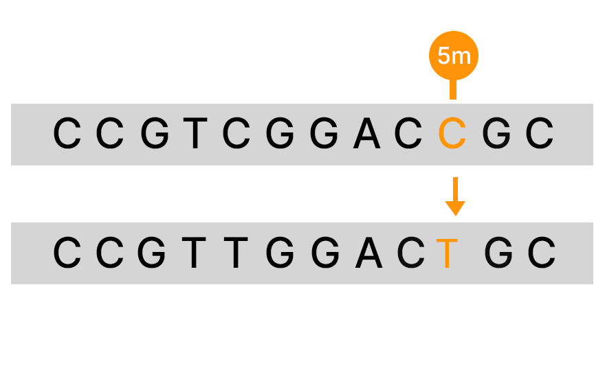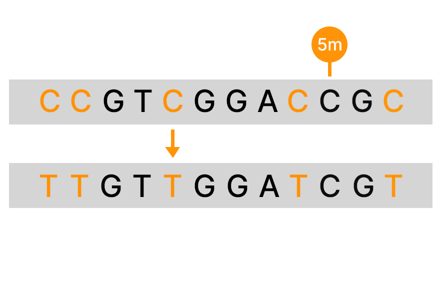An alternative to bisulfite sequencing, the Illumina 5-base solution, leverages novel chemistry and analyses to enable simultaneous genetic variant and methylation detection. Illumina 5-base chemistry directly converts only 5mC to T in a simple, single-step process that is nondamaging to DNA and retains library complexity. The Illumina 5-base solution can read unmodified bases (A, T, G, C) and 5mC in a single assay.